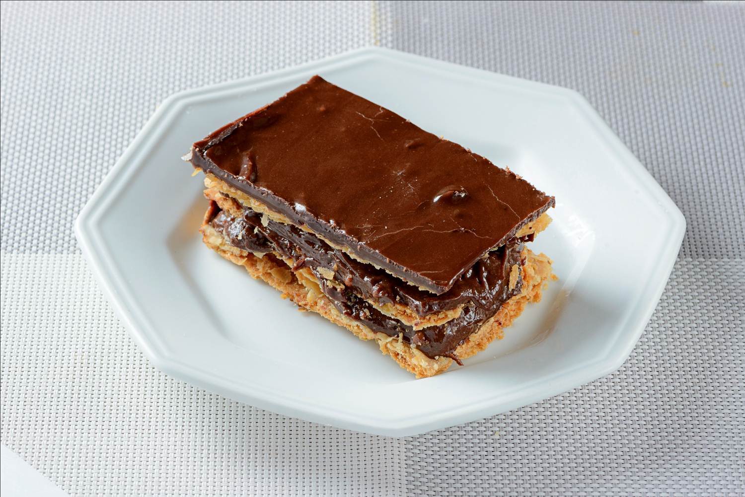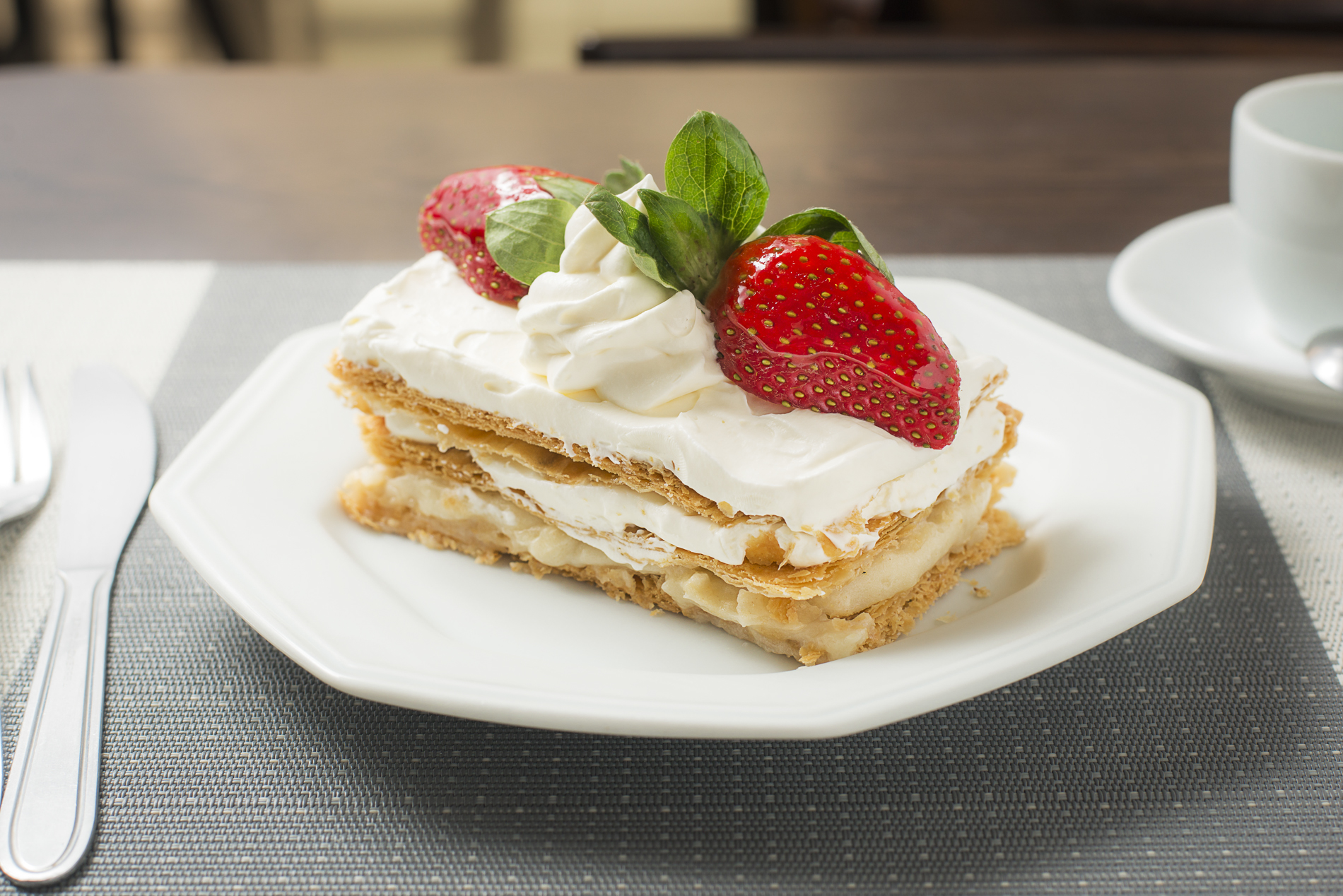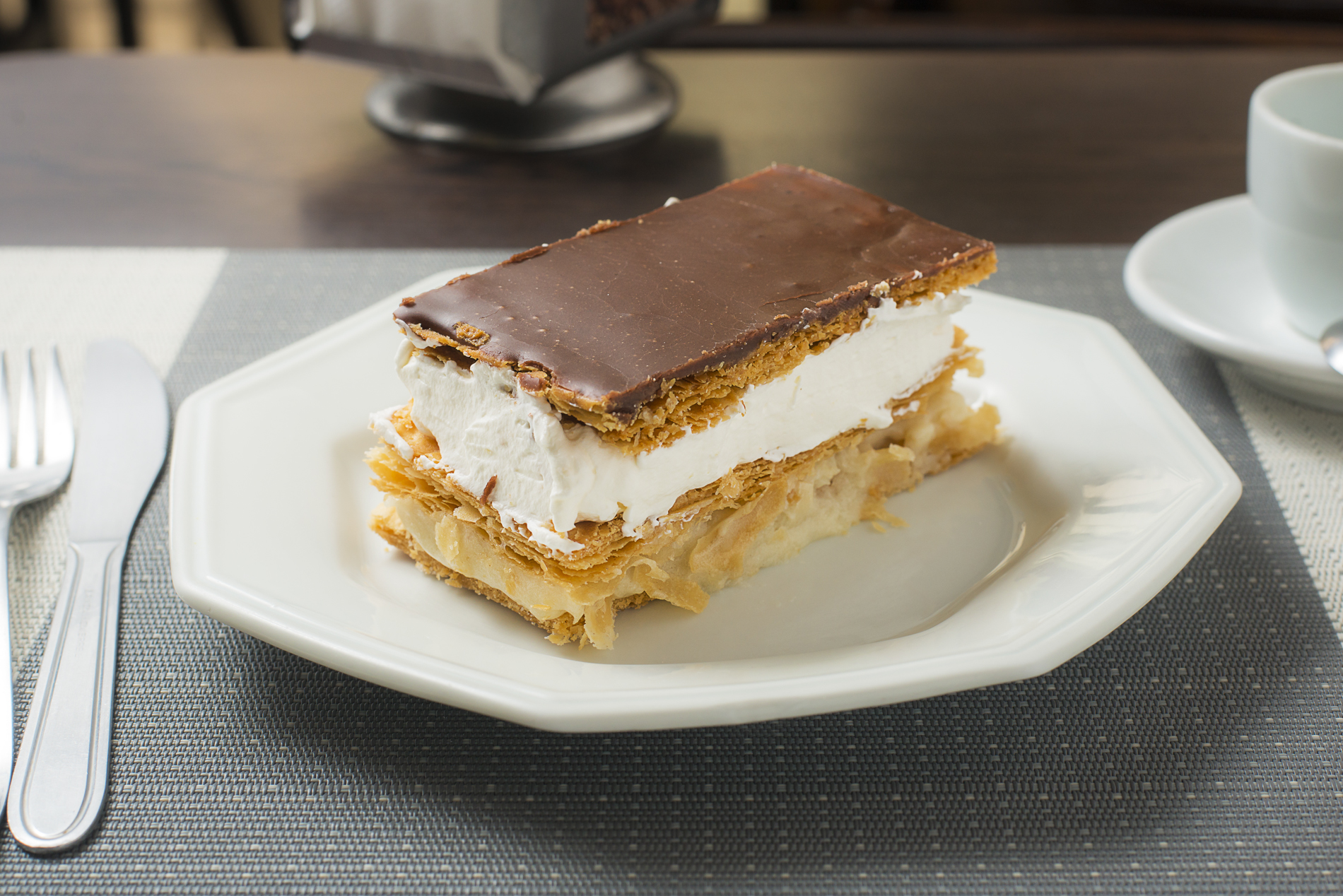 Mil-folhas (Krémes) - creme de baunilha, chocolate, chocolate meio amargo, chantilly com chocolate (Francia Krémes), chantilly com morangos ou damasco, chantilly e pêssego ( por encomenda).