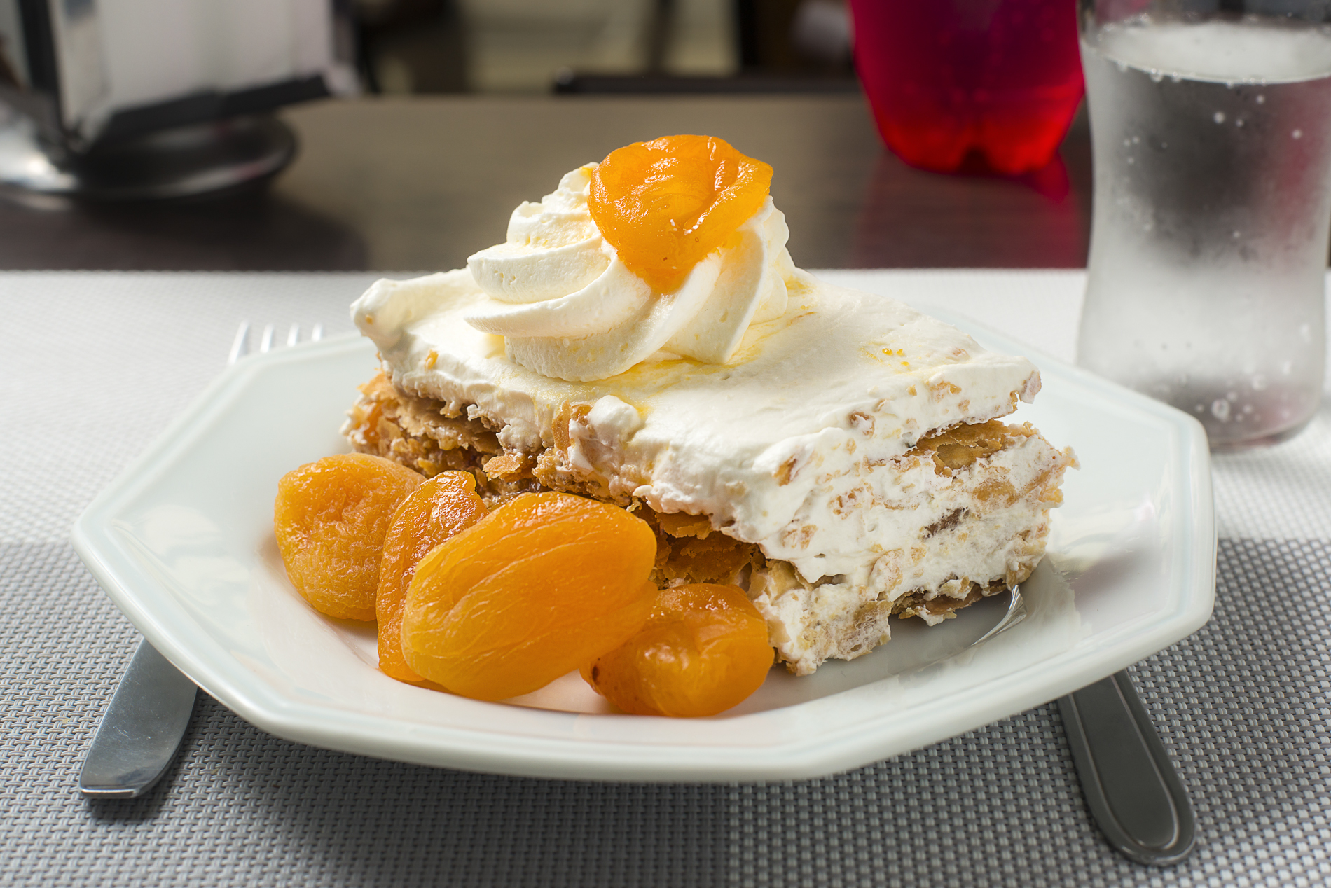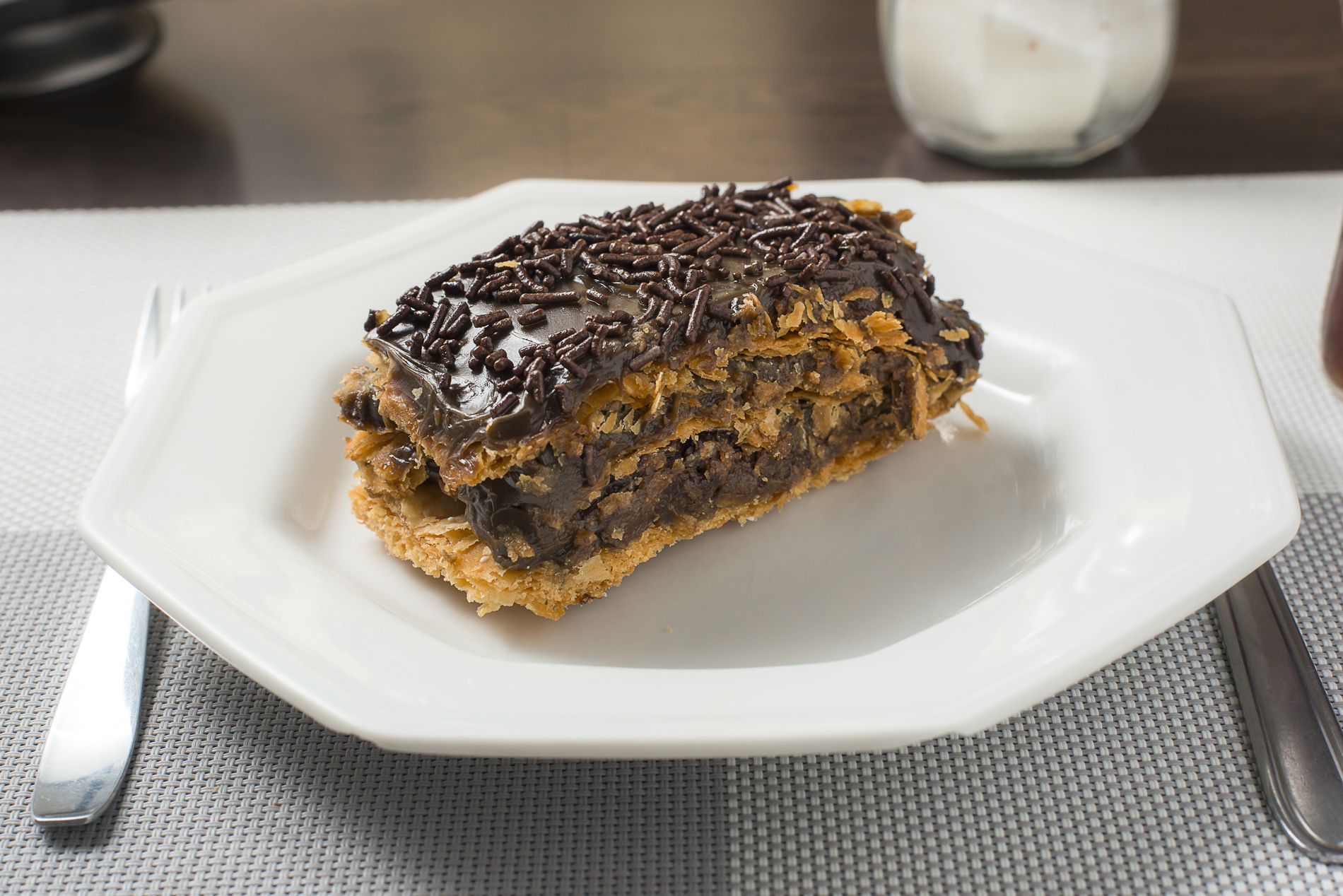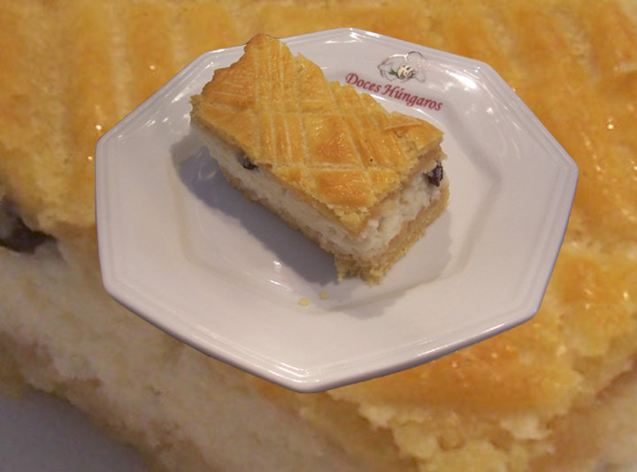 Mil-folhas (Krémes) - creme de baunilha, chocolate, chocolate meio amargo, chantilly com chocolate (Francia Krémes), chantilly com morangos ou damasco, chantilly e pêssego ( por encomenda).
