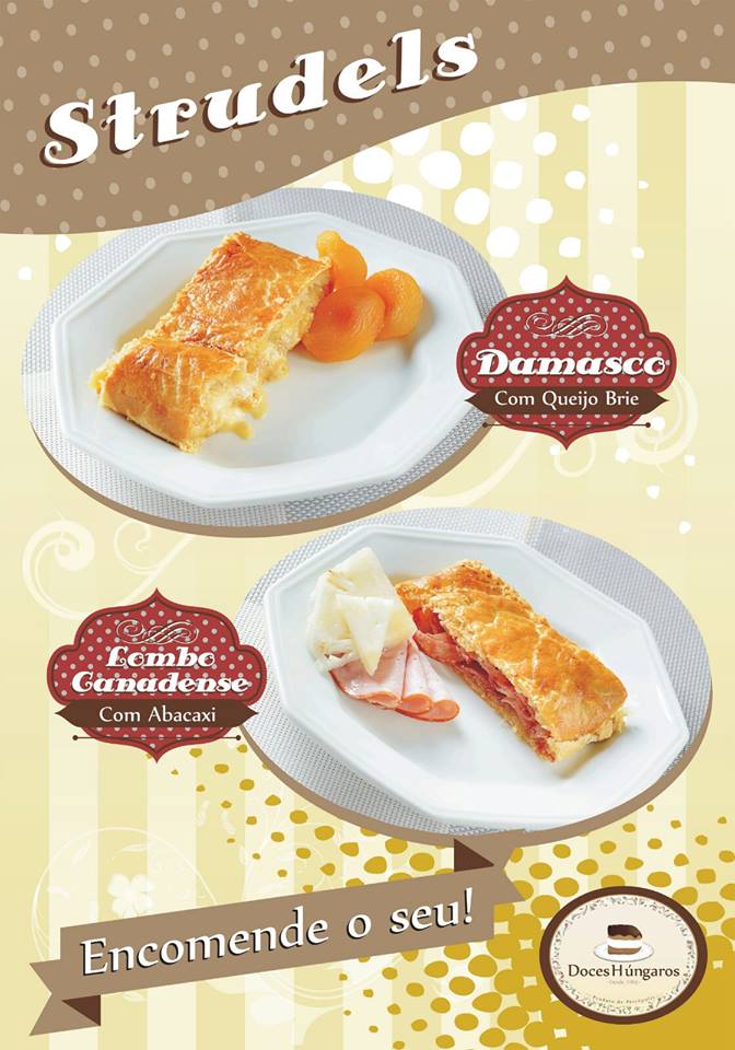 Strudel (10 fatias) - maçã, maçã com nozes, damasco, damasco com queijo brie, banana & canela, abacaxi, lombinho canadense com abacaxi, ameixa